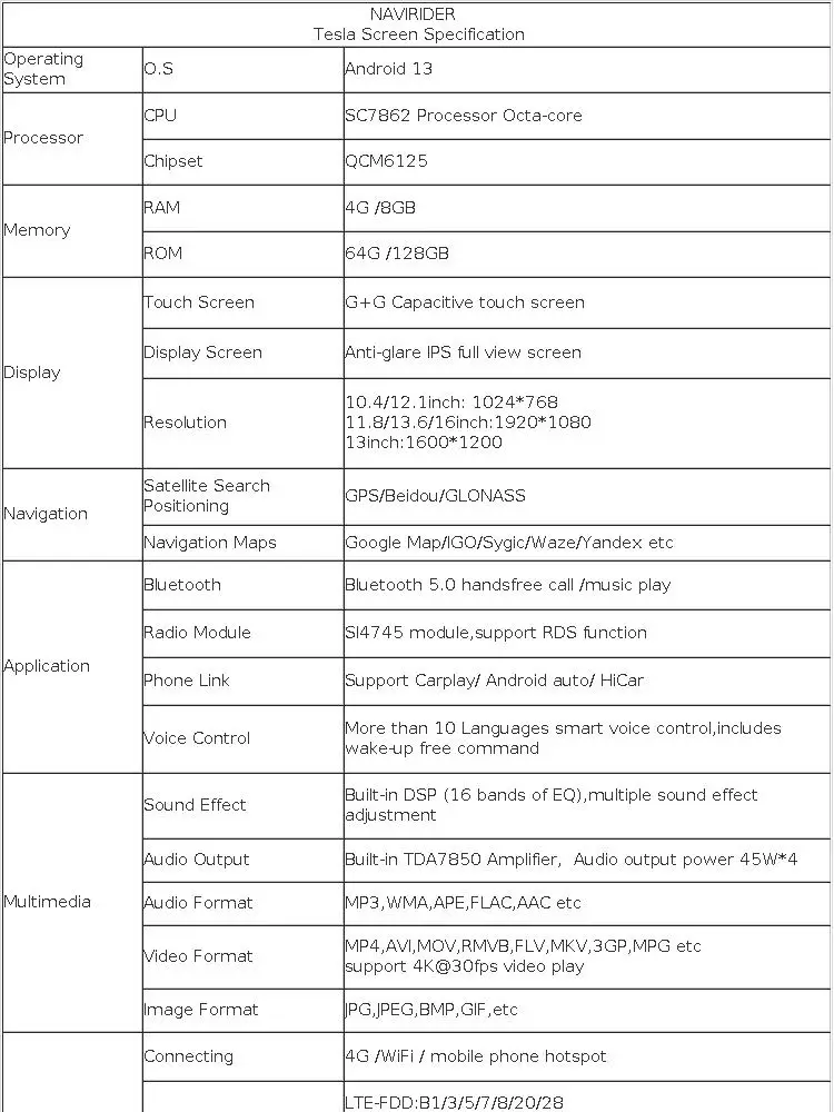 Tesla Screen Specification